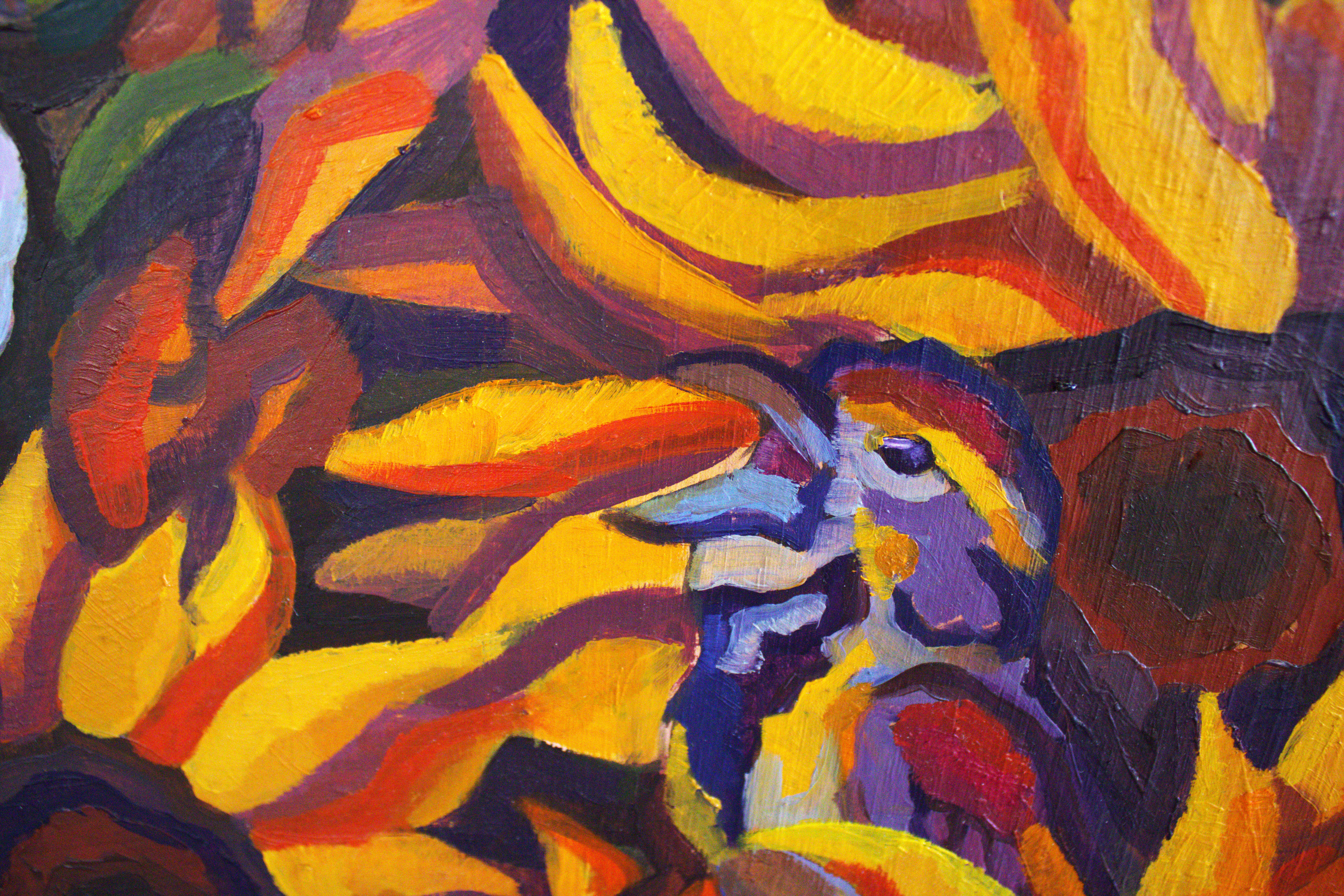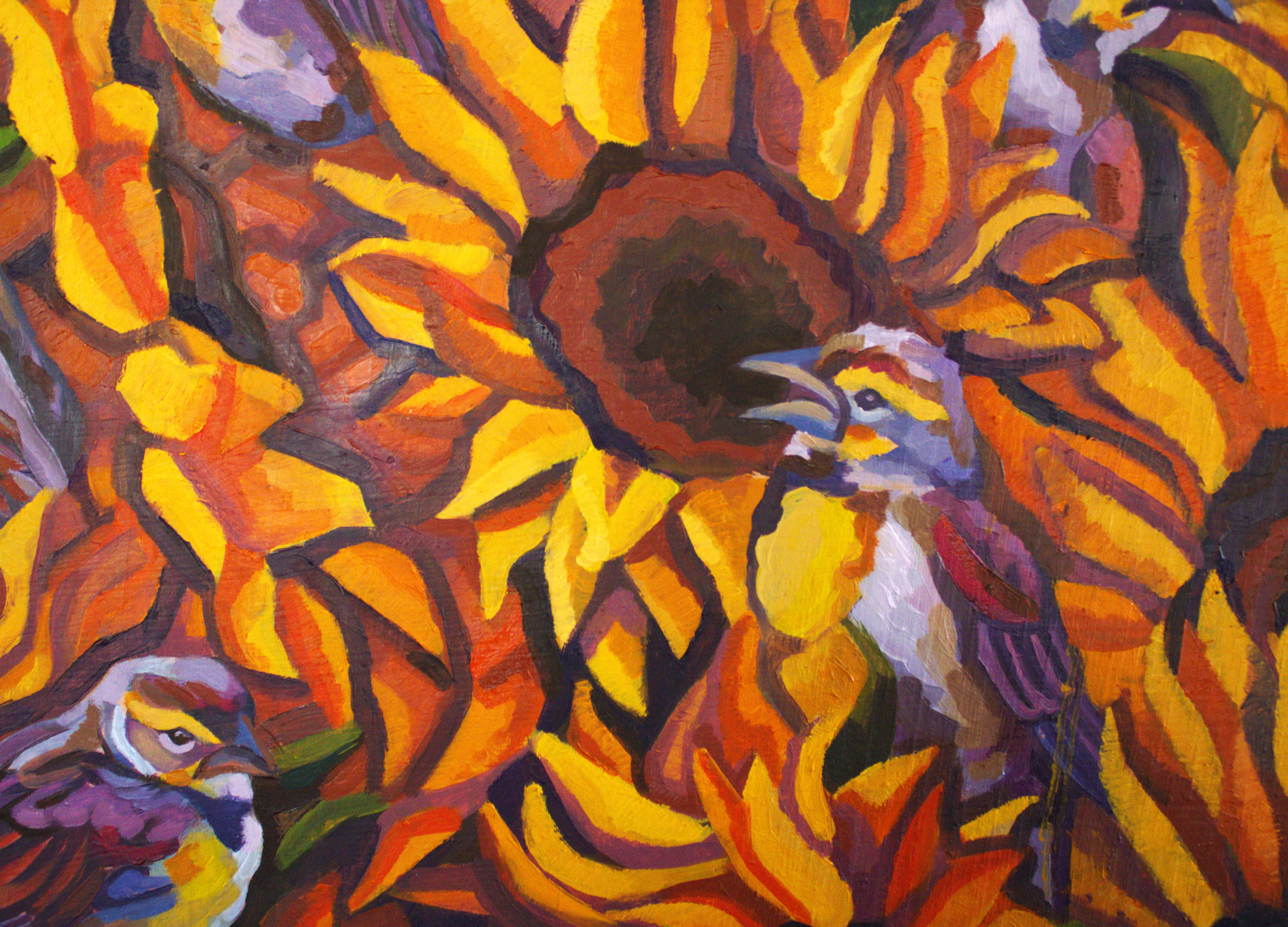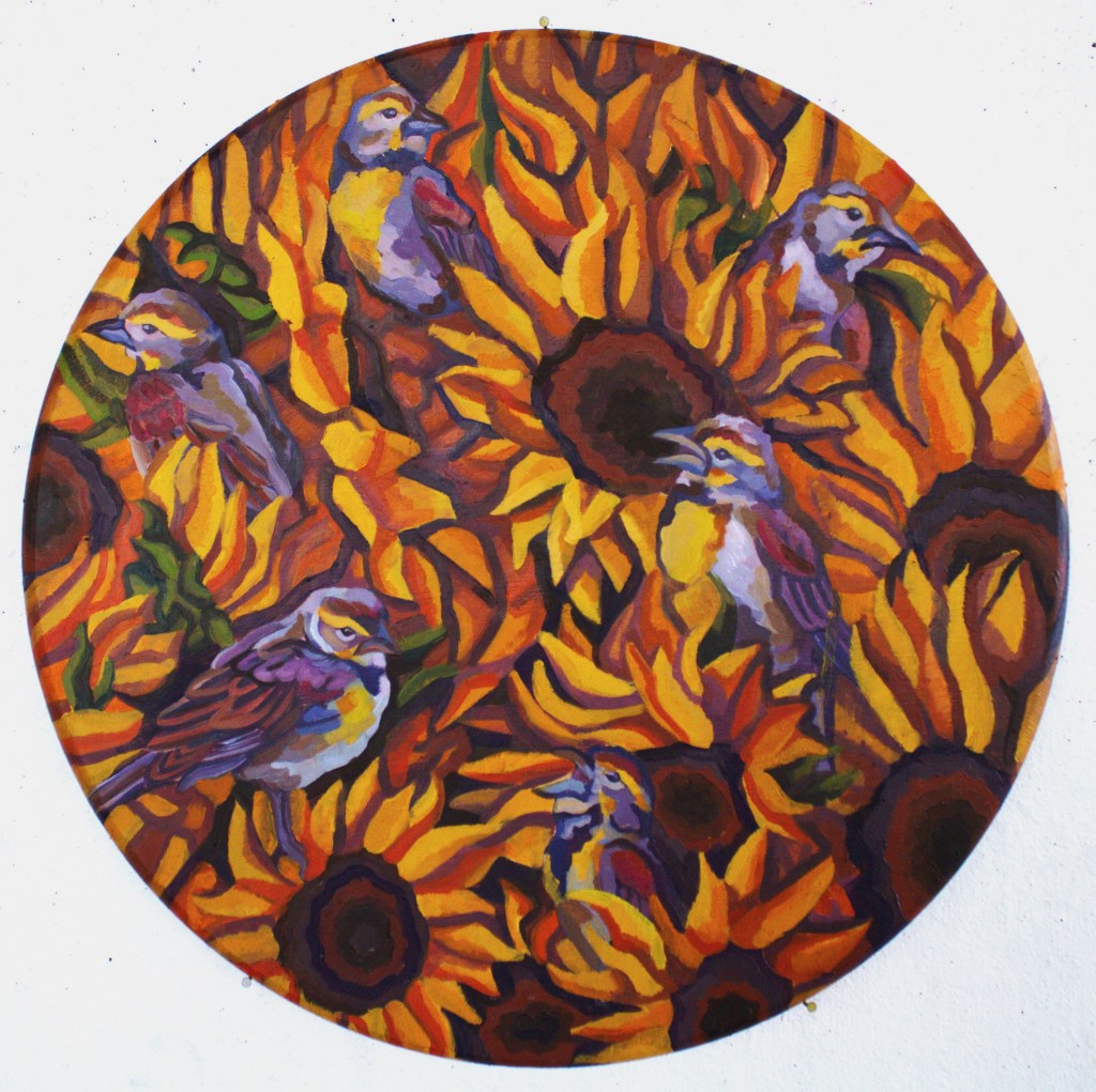 Dickcissel’s In Sunflower Patch, Oil on Wood Panel, 23×23 Inches, 2022