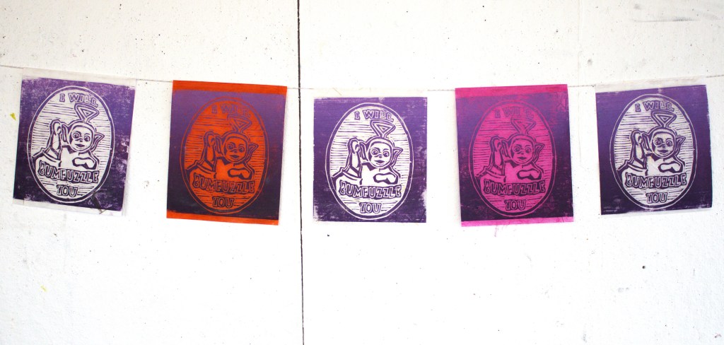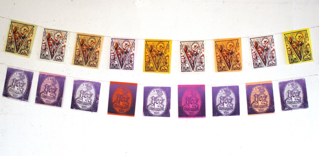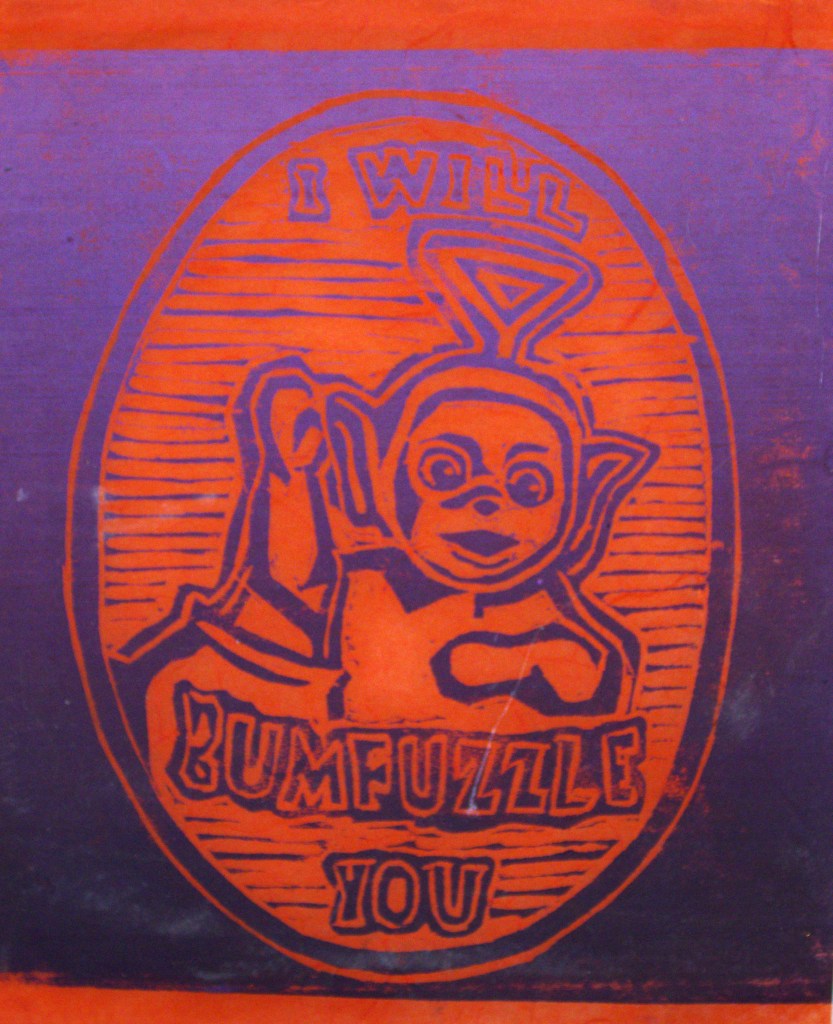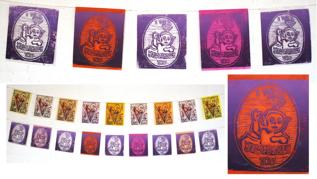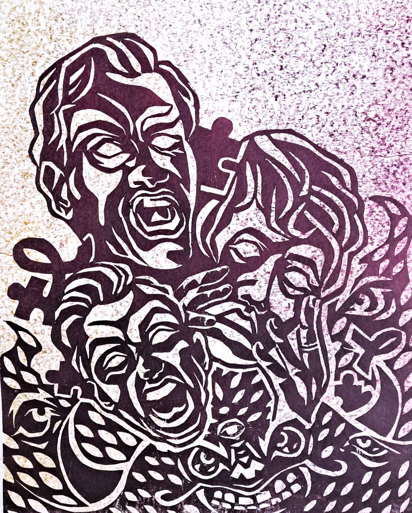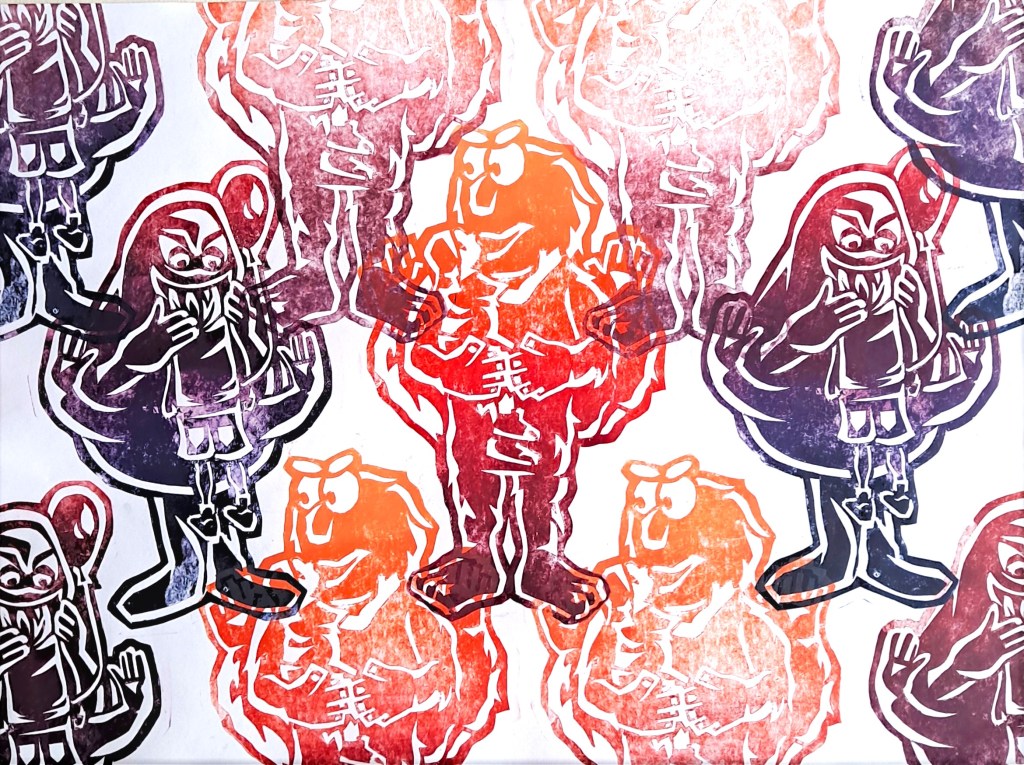 The Controversy of TinkieWinkie, Woodblock Print, 10×8 Inches, 2023