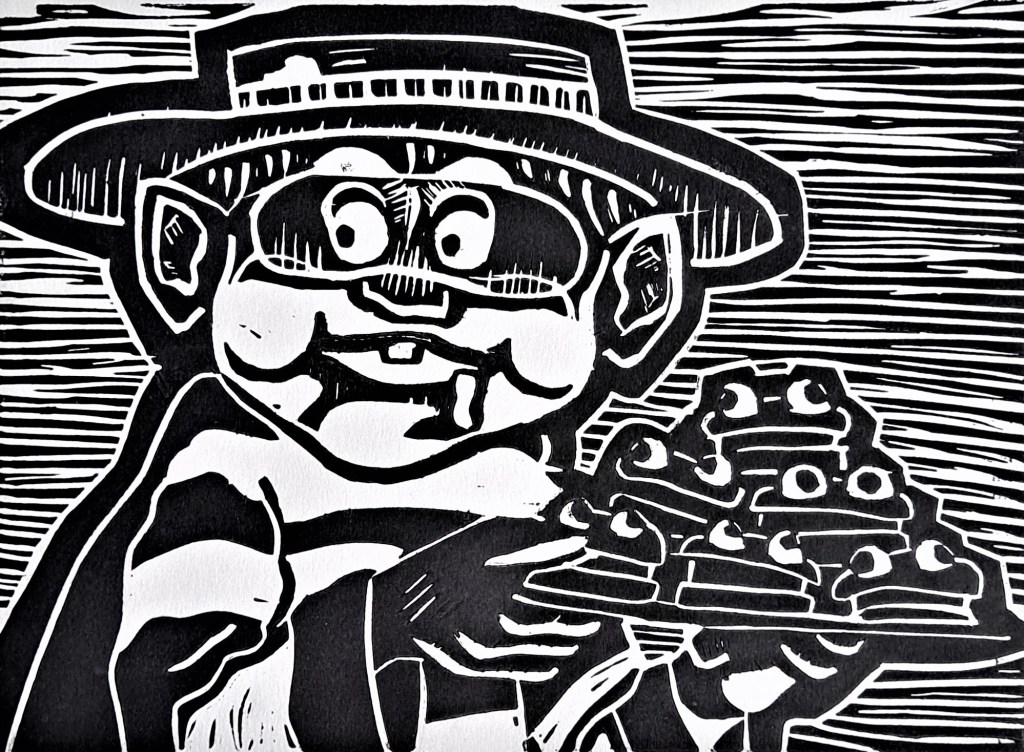 The Hamburgular Strikes Again, Linoleum Print, 8×10 Inches, 2021
