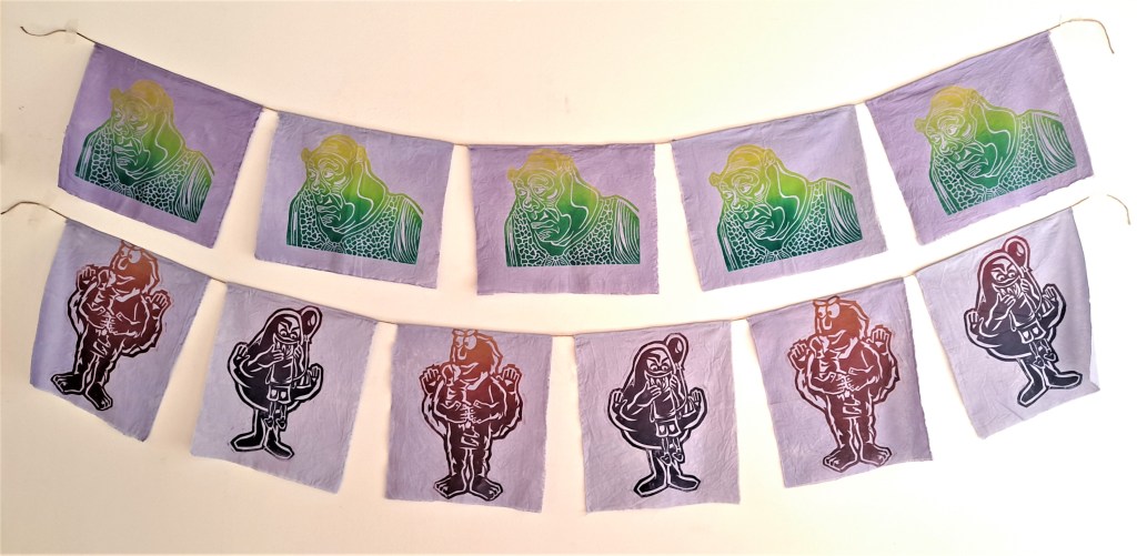The Return of Evil Grimace, Linoleum and Stencil Prints, 22×30 Inches, 2021